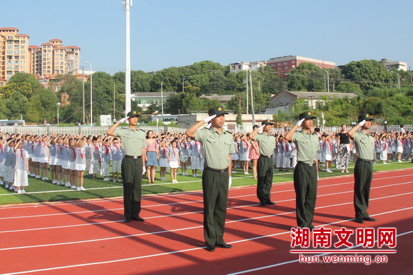 9月3日,长沙芙蓉区马坡岭小学,军人叔叔和孩子们一起参加升旗仪式。