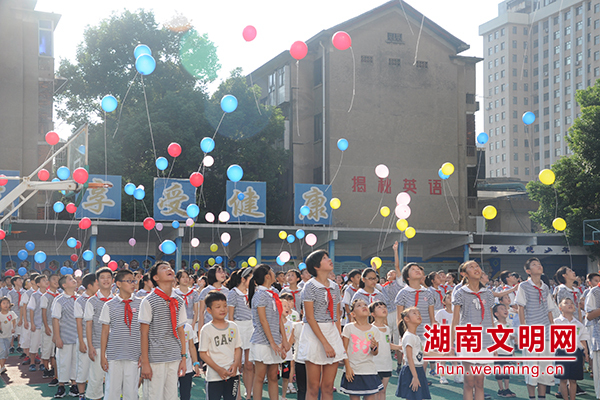 燕山小学六年级的大哥哥大姐姐们与一年级新生一起放飞手中气球,放飞梦想。图片来源:湖南文明网 记者 黄藤 摄