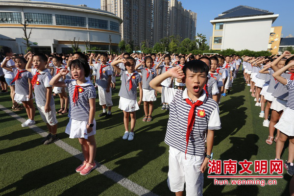 9月3日,开学第一天,正值抗战胜利73周年纪念日,长沙芙蓉区各小学在开学第一课上,重温抗战历史、缅怀革命英烈,以特别的方式迎接开学第一课。