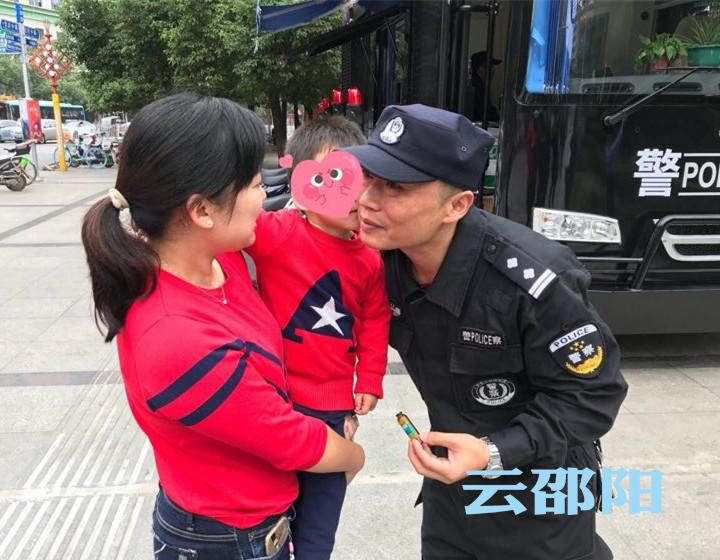 2017年国庆期间,“邵阳快警”屯警街面之初,一名在城南公园游玩的幼童怎么也不肯吃母亲喂给他的药。正在城南公园快警平台上执勤的谢荣凭着他的劝导天分,不仅哄得孩子乖乖喝下口服液,还赢得了孩子的甜蜜一吻。