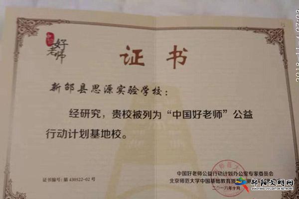 邵阳文明网11月6日讯(通讯员 曾德平 何喜祥)11月4日,从湖南省中小学教师发展中心传来喜讯,新邵思源实验学校被确定为湖南省“中国好教师”公益行动计划基地校。