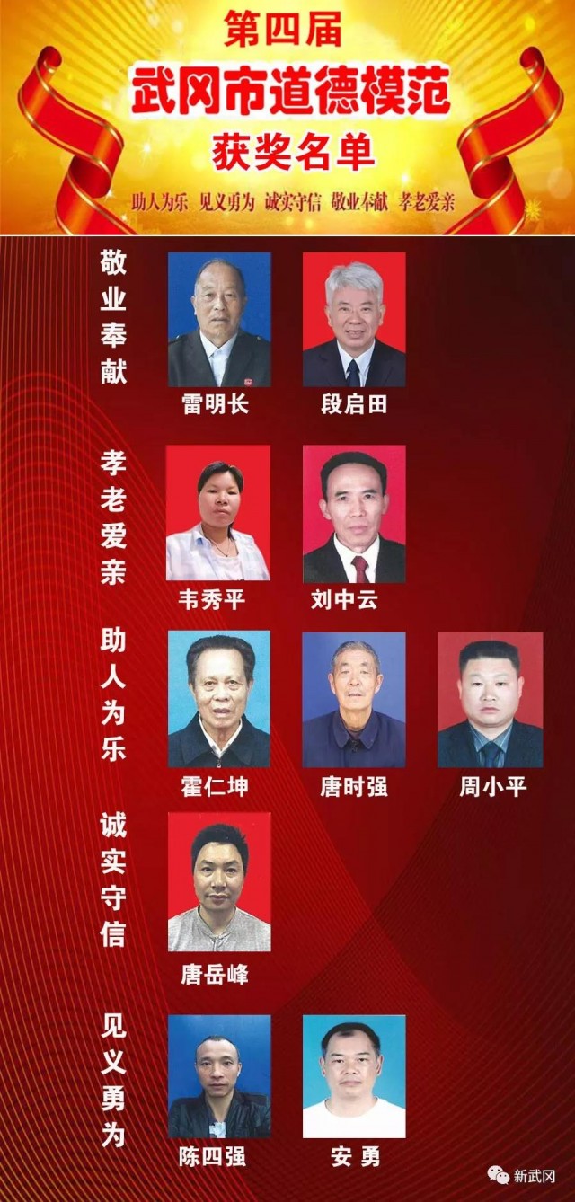 在上榜的这些道德模范中,有古稀之年还奔走在禁毒路上的禁毒帮教员、退休教师雷明长;有独自承担起照顾瘫痪丈夫和患病公公的好心肠女人韦秀平;有自筹资金传播乡土文明,让家乡变成一个有文化信念和道德追求的霍仁坤;有为了老百姓利益做最忠实守护者的唐岳峰;有一身正气大义凛然与危害学校安全的歹徒作斗争的陈四强。他们以自己的模范行为,弘扬社会主义核心价值观,集中展示武冈社会主义思想道德建设丰硕成果,推动形成崇德向善良好的社会氛围。