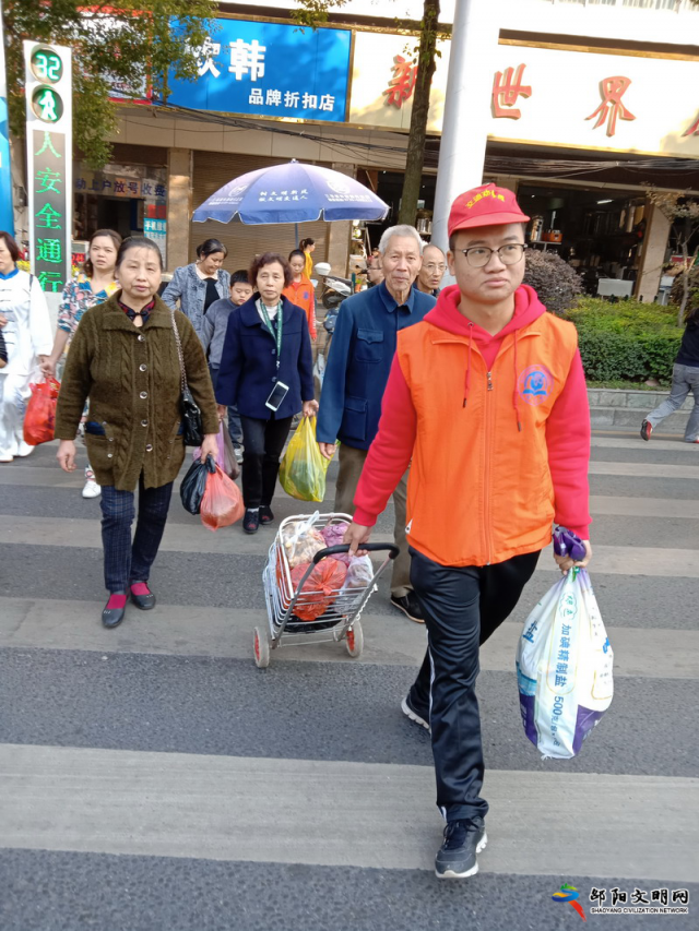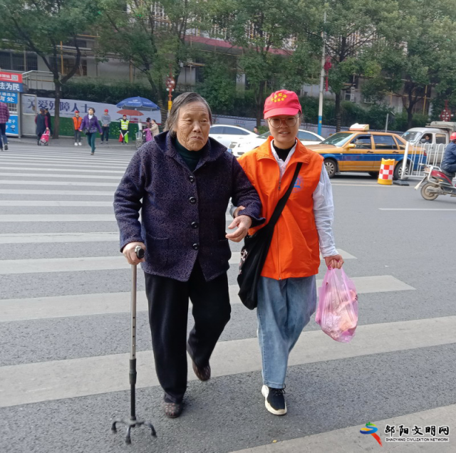 邵阳文明网11月9日讯 “奶奶,您好,我扶您过斑马线吧!”11月3日上午,在邵阳宝庆路市委门口,一名由市交警支队组织的邵阳学院大学生志愿者,主动走到一位手持拐杖意欲横过斑马线的老奶奶身边,热情地扶着她安全横过道路感人画面,获得了广大过往群众的一致赞许,成为了邵阳街头一处靓丽的风景。