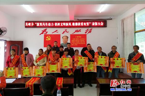 邵阳文明网11月12日讯 为树立典型,鼓舞士气,全力打好脱贫攻坚战役,11月11日,绥宁县关峡苗族乡召开“激发内生动力,倡树文明新风,助推脱贫攻坚”表彰大会,对在全乡范围内评选推出的51名先进典型进行了表彰。