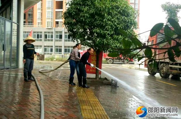 汉园业主委员会成员与物业公司工作人员一起冲洗小区道路。