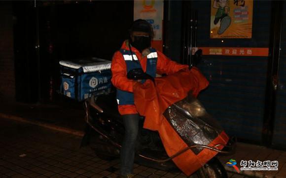 11日凌晨2:00,外卖小哥骑车电动车“全副武装”穿梭着。为了准时将订单送到客户手中,图片中的外卖小哥来不及将名字告诉记者。