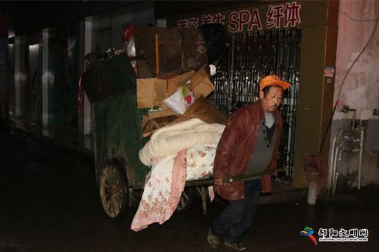 11日凌晨1:30,在双清区通衡街巷子,环卫工人雷志亮正准备将一车垃圾运走。像这样的垃圾,在他负责的片区一晚上至少要清理三车。他说,即便天气再冷,也要将最干净的街道呈现在市民眼前。