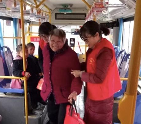 志愿者帮助老人下车