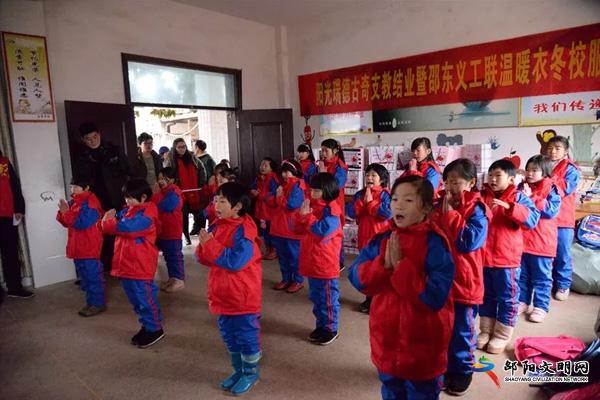 邵阳文明网1月2日上月28日,寒流侵袭,但在邵东县双凤古奇学校内却暖意融融,90名孩子和来自美国阳光瑞德公益支教团队的支教老师们,以及义工联的义工们齐聚一堂,在这里举行阳光瑞德古奇支教结业仪式暨邵东义工联”温暖衣冬·爱在古奇”校服捐赠仪式。