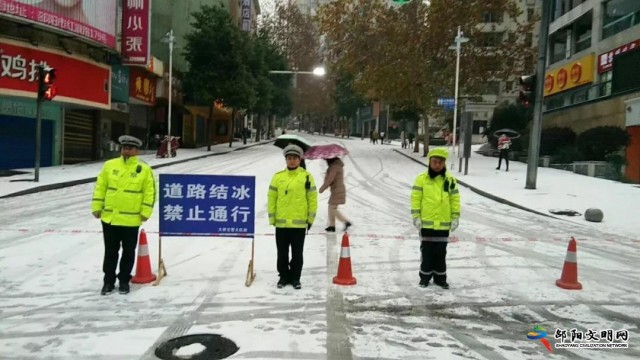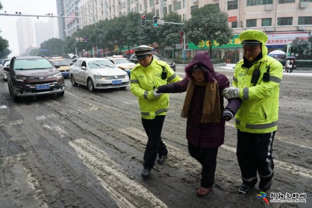 邵阳文明网1月2日讯 上月30日,持续一夜的雪花将邵阳城区完全覆盖,处处银装素裹,路面的积雪和冰冻给出行的车辆带来了极大的不便。早上7点起,城区所有可用警力就全部奔赴路面,以流动巡逻为主执勤守点为辅,以国省县道、事故多发路段为重点区域,全力加大防控力度。在缤纷的大雪中,随处可见执勤交警穿梭的身影,或在路中间指挥交通看事故、或在路口铲雪立警示牌、或为被困司机推车、或帮扶老人小孩通过马路,他们置身于冰雪中用爱心温暖过往的所有人,用自己的身躯竖起平安的路标。