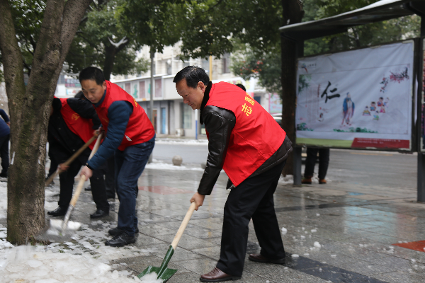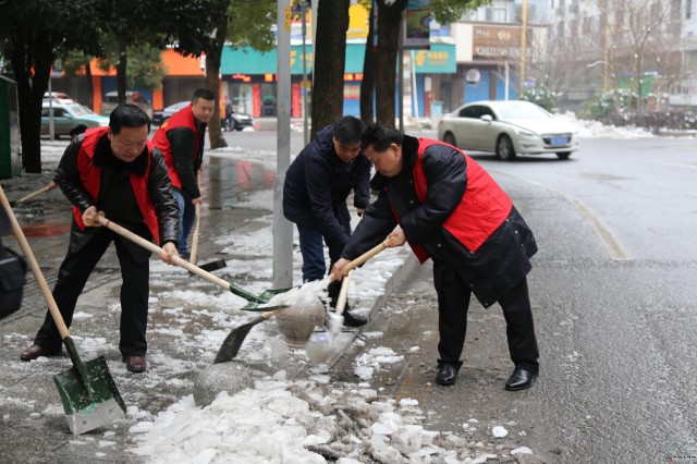 邵阳文明网1月3日讯元旦节假日期间,气温骤降,邵阳市区下起了大雪,路面变得冰冻湿滑,出行隐患剧增。为让市民在元旦期间出行方便、安全的过节,1月1日上午,邵阳市政府办50名党员干部组成的志愿者抗冰防冻突击队,在市区沿江桥、资江南路沿线开展铲雪除冰志愿服务活动。