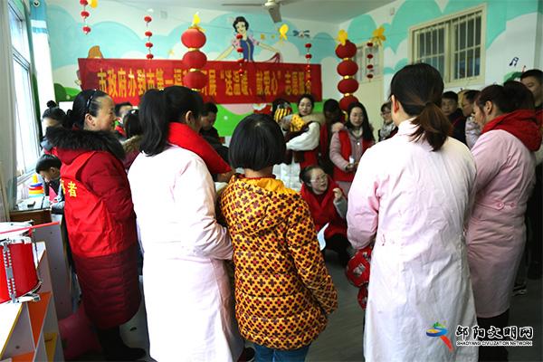 邵阳文明网1月18日讯 1月17日上午,邵阳市人民政府办公室20余名党员干部到市第一福利院开展“送温暖、献爱心”志愿服务活动。志愿者们为福利院的孩子们送去了棉袜、儿童书本、糖果以及各类水果等物资,并且陪孩子们一起做游戏、讲故事,和孩子们一起度过一个愉快的上午。