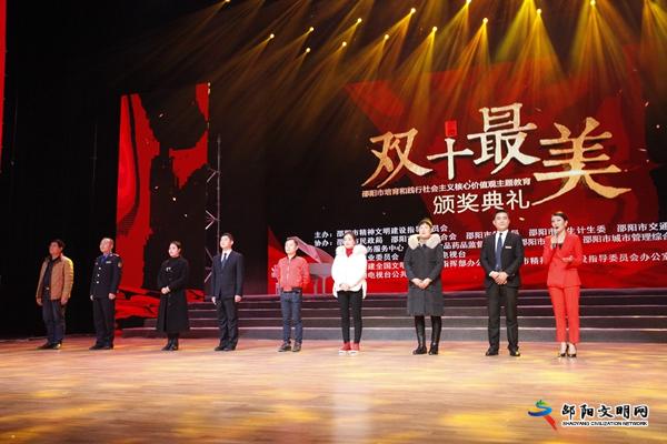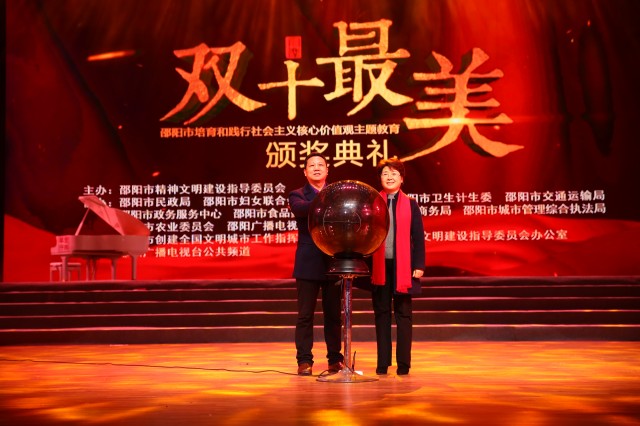 1月18日下午,由邵阳市精神文明建设指导委员会主办,邵阳市创建全国文明城市工作指挥部办公室、邵阳市精神文明建设指导委员会办公室、邵阳广播电视台承办,邵阳市民政局、邵阳市妇女联合会等单位协办的“邵阳市培育和践行社会主义核心价值观主题教育双十最美颁奖典礼”在市文化艺术中心举行。市领导周迎春、李华和出席活动。