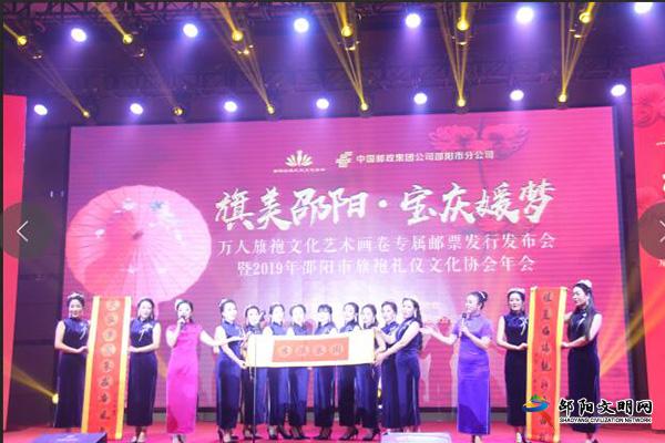 邵阳文明网1月22日讯 1月20日下午,“旗美邵阳·宝庆媛梦”万人旗袍文化艺术画卷专属邮票发行发布会暨2019年邵阳市旗袍礼仪文化协会年会在市区举行。活动由邵阳市邮政分公司与邵阳市旗袍礼仪文化协会联合承办。