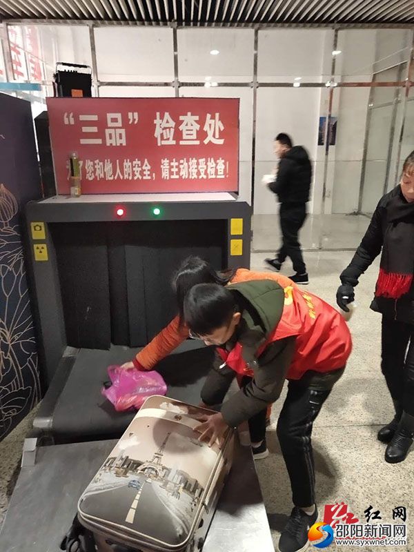 图为刘玉奇帮旅客把行李箱放到“三品”检查处接受检查