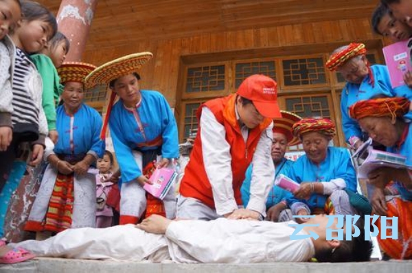 志愿者向村民传授触电急救心肺复苏技能