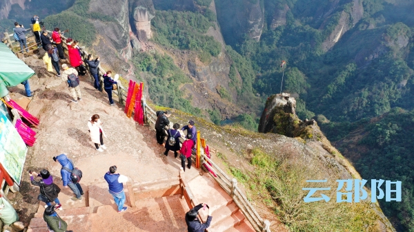 邵阳文明网3月7日讯 3月3日,邵阳迎来了久违的阳光,新宁县崀山风景区八角寨上也是时而阳光万里,时而云雾缭绕,秀美的风景吸引了不少游客前往观赏。
