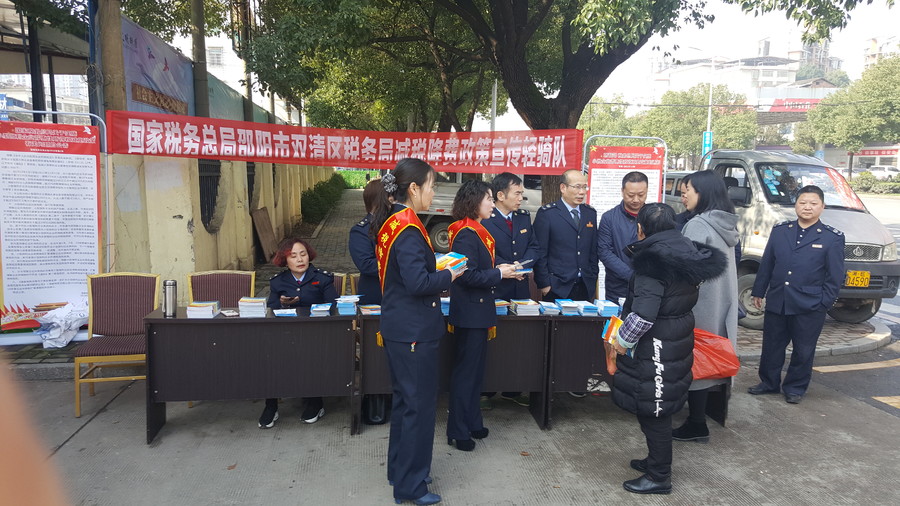邵阳文明网3月13日讯 3月11日上午,一支由60名双清区税务局工作人员组成的减税降费政策宣传“轻骑队”出发了。这支轻骑队共分为6组,每组10人,分别去往双清区步行街、青龙桥头、建材城一期、邵阳经济开发区、口味王槟榔、高崇山镇等6个地方进行减税降费的宣传,面对面解答纳税人的涉税咨询。