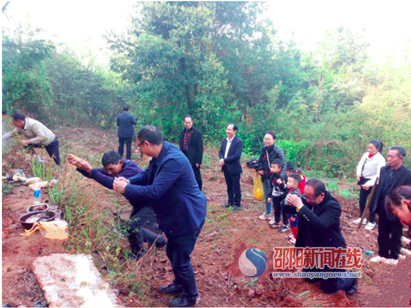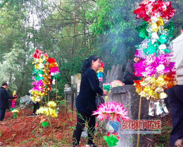 邵阳文明网4月8日讯“行清明扫挂礼,全体肃立、默哀、哀毕。主祭者黄均贤跪......”4月5日上午,在邵阳县诸甲亭乡神山村神山片某山头,同一先祖的四个大家庭的四代人相聚,开展扫墓活动。现场有男有女,有老有小,有鲜花,有清纸,祭品有鸡鱼肉、米酒、清茶,程序有默哀、三鞠躬、行祭奠礼、诵读祭文。祭拜者中有邵阳市中级人民法院的老干部、邵阳县统战部干部、退休教师、村民小组长等。