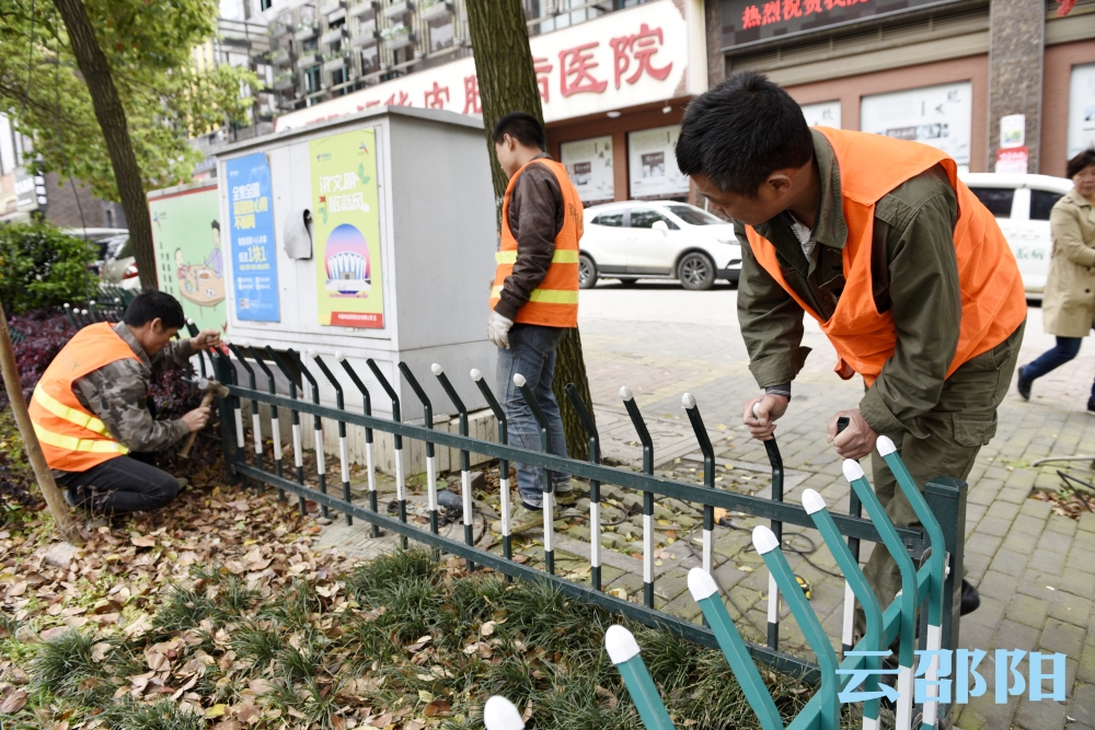 邵阳文明网4月11日讯 4月10日下午,邵阳市街道绿化管理所工人在市区宝庆西路维修绿化带护栏。