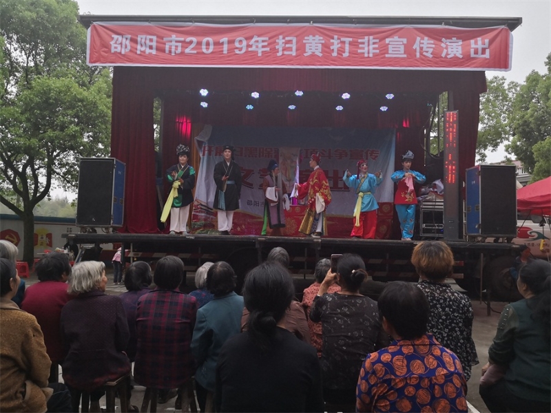 邵阳文明网4月22日讯 4月19日上午,一场别开生面的文化盛宴在新邵县坪上镇卫星村热闹上演。邵阳市花鼓戏剧团带来的花鼓戏对扫黑除恶专项斗争加以诠释,向群众表明党委、政府“有黑扫黑、有恶除恶、有乱治乱”的决心;坪上镇妇联及巾帼志愿者们为孩子们上了一堂生动的“国学讲堂”,让学生感受国学魅力和民族文化的博大精深,弘扬中华美德。