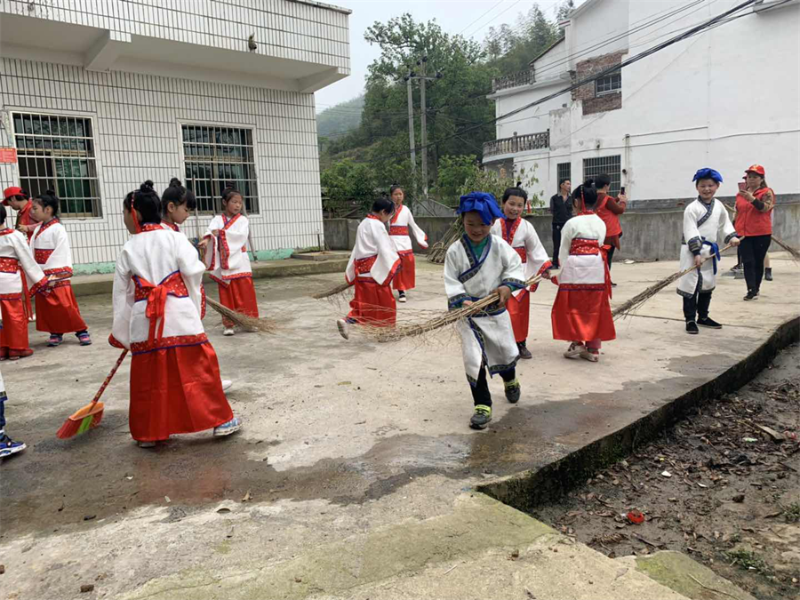 在“国学讲堂”上,志愿者先带领小朋友们诵读课文《三字经》,并详细讲解了《三字经》背后的含义,引申出孔融让梨的故事。生动活泼、绘声绘色的讲解,使小朋友们在欢乐的气氛中、丰富的国学文化中,汲取营养和领悟修身做人之道、处世之道。课堂结束后,小朋友们不仅主动合唱国歌,还和家长、志愿者们一起开展了“小手牵大手”打扫院落卫生的活动。