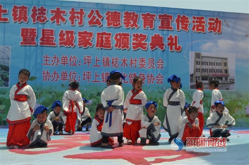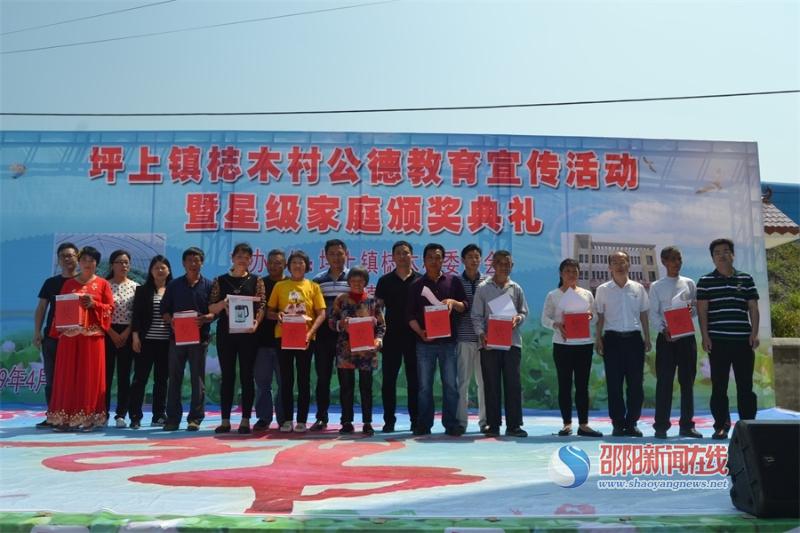 邵阳文明网4月26日讯 4月25日上午,新邵县坪上镇梽木村活动中心热闹非凡,不断响起一阵又一阵地掌声、喝彩声,梽木村公德教育宣传活动暨星级家庭颁奖典礼正在这里隆重上演。市委督察办、县委办、县城建局、县人民医院、坪上镇等单位相关领导出席活动。