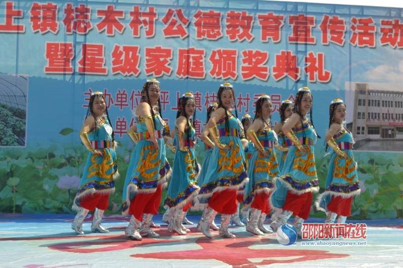 活动由一场优美的广场舞《天美地美中国美》拉开了序幕。整个活动节目精彩纷呈,独唱、花鼓戏、舞蹈、越剧、评剧、小品、朗诵等节目轮番上演,其中小品《留守儿童》真实地反映了农村留守儿童的现状,引起了现场观众的共鸣与反思;小学生用他们稚嫩有力的声音朗诵《村规民约之德为美》,将村规民约深深印进人的心里。在穿插的16个节目中,重点对梽木村的4个“三星级平安家庭”、4个“道德模范家庭”、9个“文明卫生家庭”、4个“勤劳致富家庭”进行了表彰。