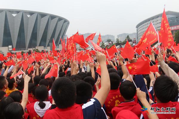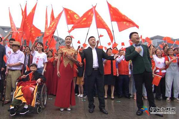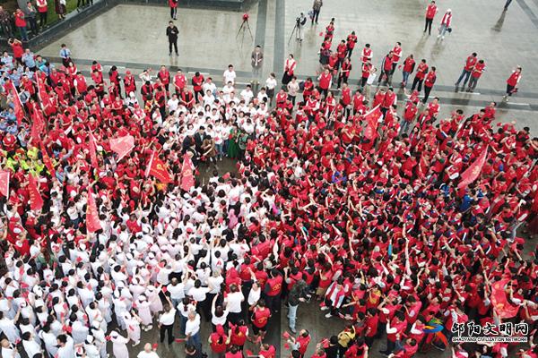 随后,来自各有关单位、乡镇、学校的近万名身穿志愿服务红马甲的志愿者齐聚爱莲广场,挥舞着手中的红旗,一同唱响《我爱你中国》等歌曲,抒发对祖国的热爱。