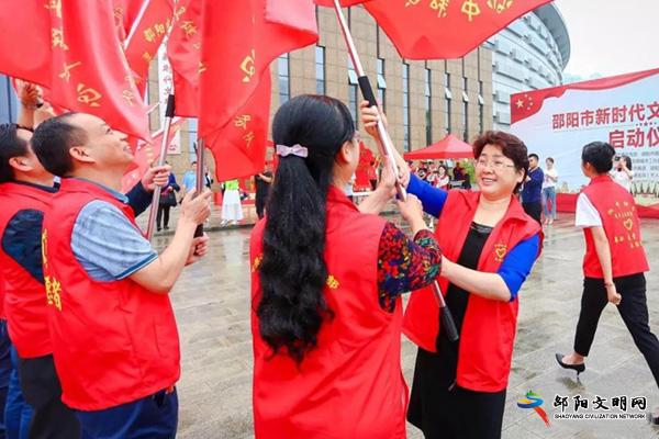 邵阳文明网5月30日讯 5月30日上午,邵阳市新时代文明实践中心在邵阳市文化馆揭牌成立。市委常委、宣传部长、市创文指挥部副指挥长兼办公室主任周迎春为邵阳市新时代文明实践中心揭牌,并为全市16支新时代文明实践志愿服务队授旗。