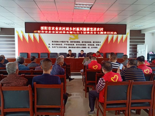 在台上村综合服务中心,邵阳市农业农村局机关第一党支部与城南街道台上村党支部举行主题党日活动,活动开始前大家一起重温了入党誓词。由市农业农村局机关第一党支部联点领导、驻村帮扶工作队员组成的“微课堂”进农村宣讲组,与台上村党员们面对面、拉家常式地宣讲乡村振兴战略等内容。