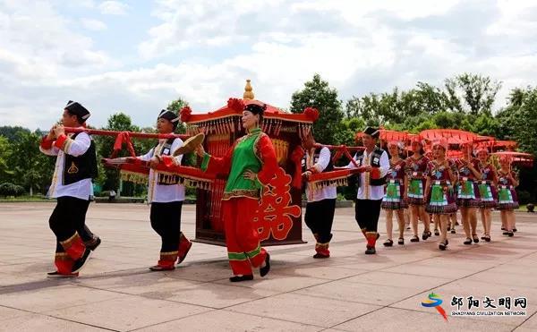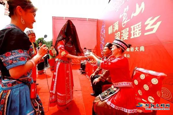 邵阳文明网6月11日讯 6月7日,崀山风景名胜区经过多次预演,推出了首个“情满崀山,浪漫瑶乡”瑶族婚俗大典。今后崀山的游客朋友可以在这里扮演“新郎”、“新娘”,体验一把崀山瑶乡传统的民族婚俗。