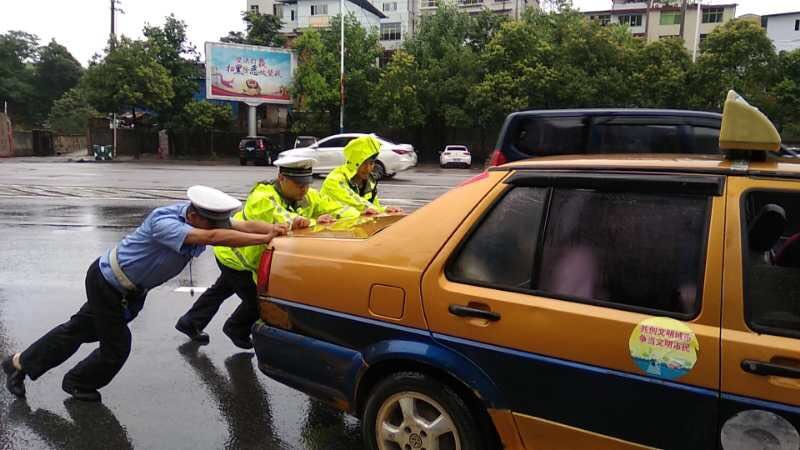 7月9日洪峰再次来临,邵阳交警全警上路,冒雨管控交通秩序。上午9时许,在资江一桥头北端一处低洼积水路面,一辆出租车因积水抛锚熄火,北塔交警大队民警与辅警冒雨将车推出积水路段。 上午9时10分许,红旗路邮政局地势低洼路段,由邵水河倒灌而来的洪水迅速漫到路面,大祥交警大队民警彭依龙趟着洪水路面,快速引导滞留在洪水中的车辆有序驶离至安全路段。