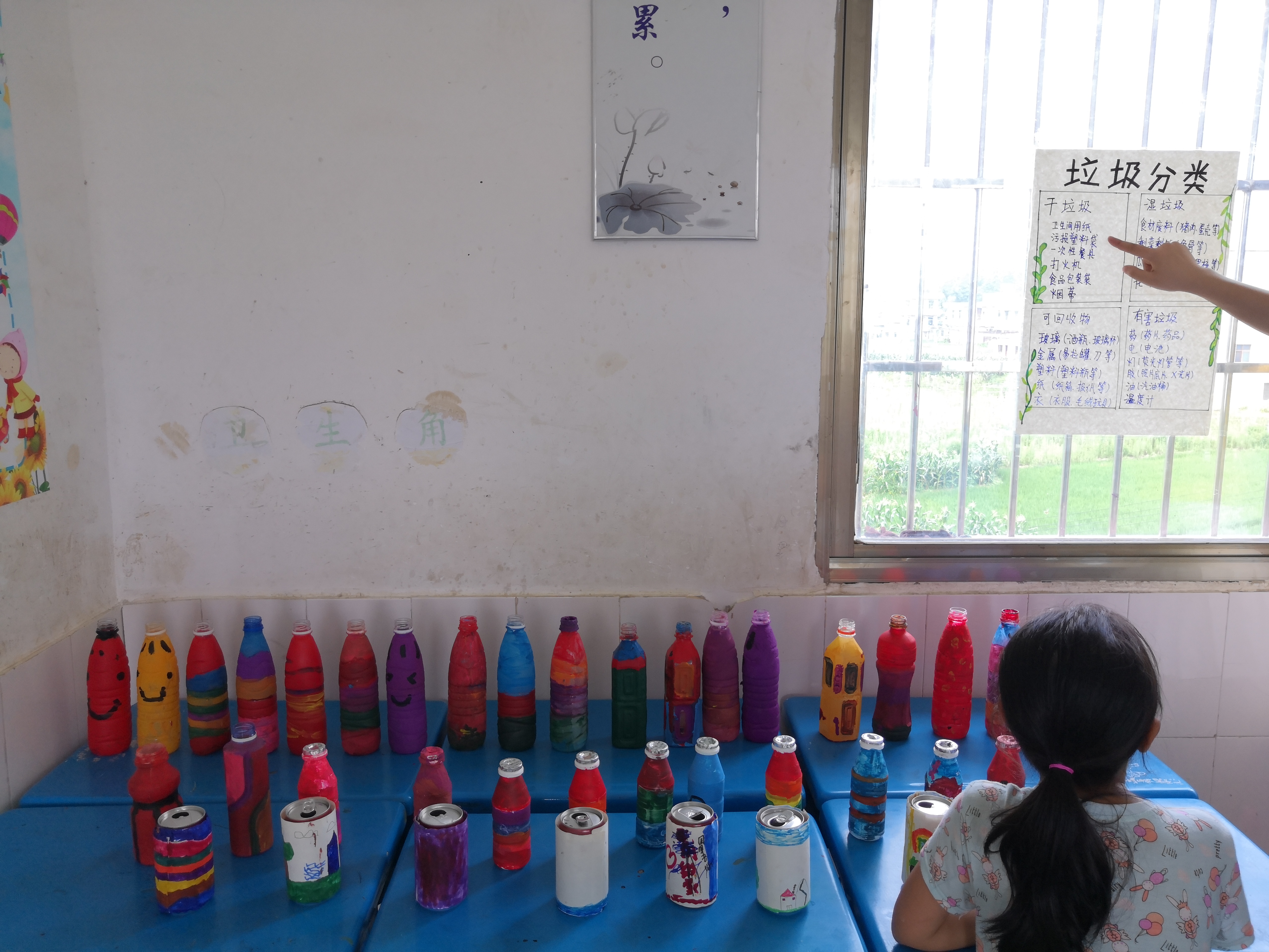 活动中,老师用兴趣记忆的方法帮助学生理解垃圾分类的标准,然后通过“抛绣球”游戏,来检验学生们的垃圾分类水平。除此之外,老师和学生们一起用“变废为宝”的方法把很多垃圾做成了精美的活动道具。比如:用废弃的卫生纸扎染出一个简易的地球平面图,让学生们能够用直观的视觉感受体会到垃圾“变废为宝”的魔力,激发他们动手创作的能力;塑料瓶被涂上各色颜料之后变为精美的插花花瓶;废弃的小纸片变成了一朵朵漂亮的玫瑰花……