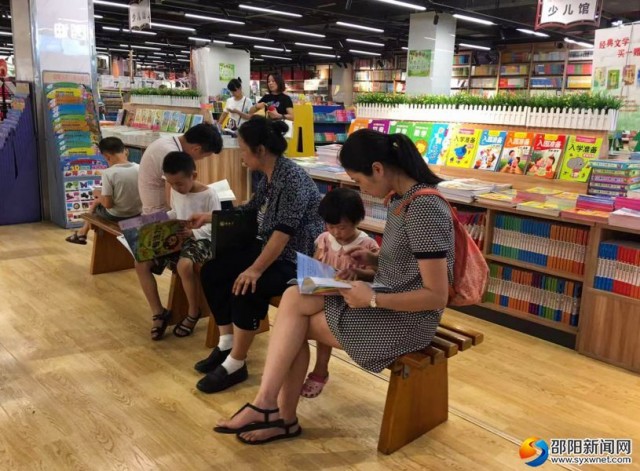 邵阳文明网8月15日讯 虽已立秋,但“秋老虎”发起威来,也不容小觑。连日来,邵阳的天气可谓是热爆了,走在街上见到的都是“熟人”,即便24小时开着空调,也不能抵挡室外灼人的高温。每年一到这时候,湘中图书城就迎来一波又一波纳凉的读者,8月14日,这里又坐满了前来纳凉看书的市民,一些没有座位的读者便站着、蹲着或倚靠在墙上,甚至席地而坐,沉浸在知识的海洋里。