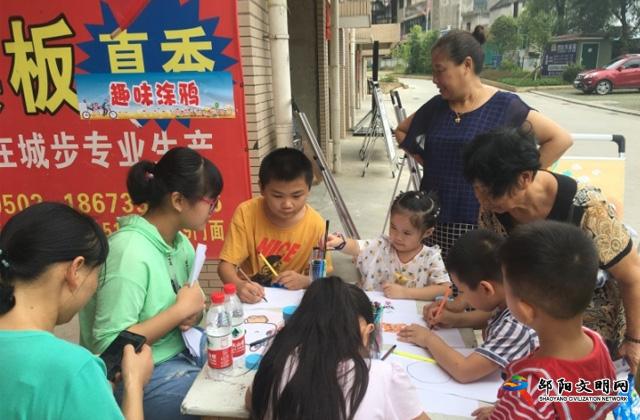 在一阴凉处,孩子们围着桌子画画、写字、做手工,当不会做的时候就跟旁边的小朋友一起探讨。