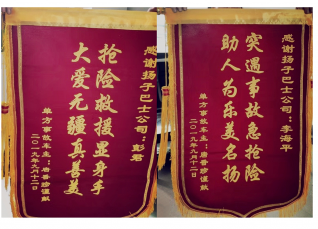 邵阳文明网9月17日讯 9月17日上午,一女士带着两面锦旗来到扬子巴士营运部,分别感谢8路公交司机彭君和5路公交司机李海平。