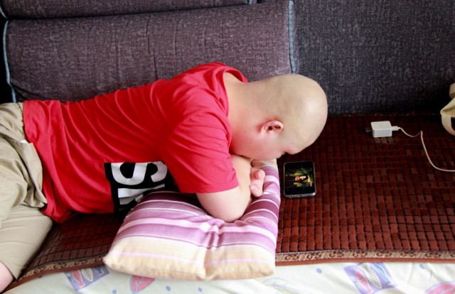 ▲窦洋喜欢看动画片,由于眼睛先天的原因,需要靠得很近,才能看清画面,图为窦洋在看动画片