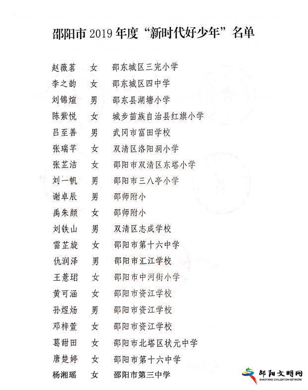 为进一步推动社会主义核心价值观落细落实,充分发挥先进典型的示范引领作用,激励广大未成年人崇尚先进、见贤思齐,传承和弘扬中华民族传统美德,今年4月以来,邵阳市文明办、市教育局、团市委、市妇联、市关工委等部门,在全市开展了“新时代好少年”推荐评选活动。经过广泛发动、层层推荐、综合评选,授予20名同学邵阳市2019年度“新时代好少年”荣誉称号。