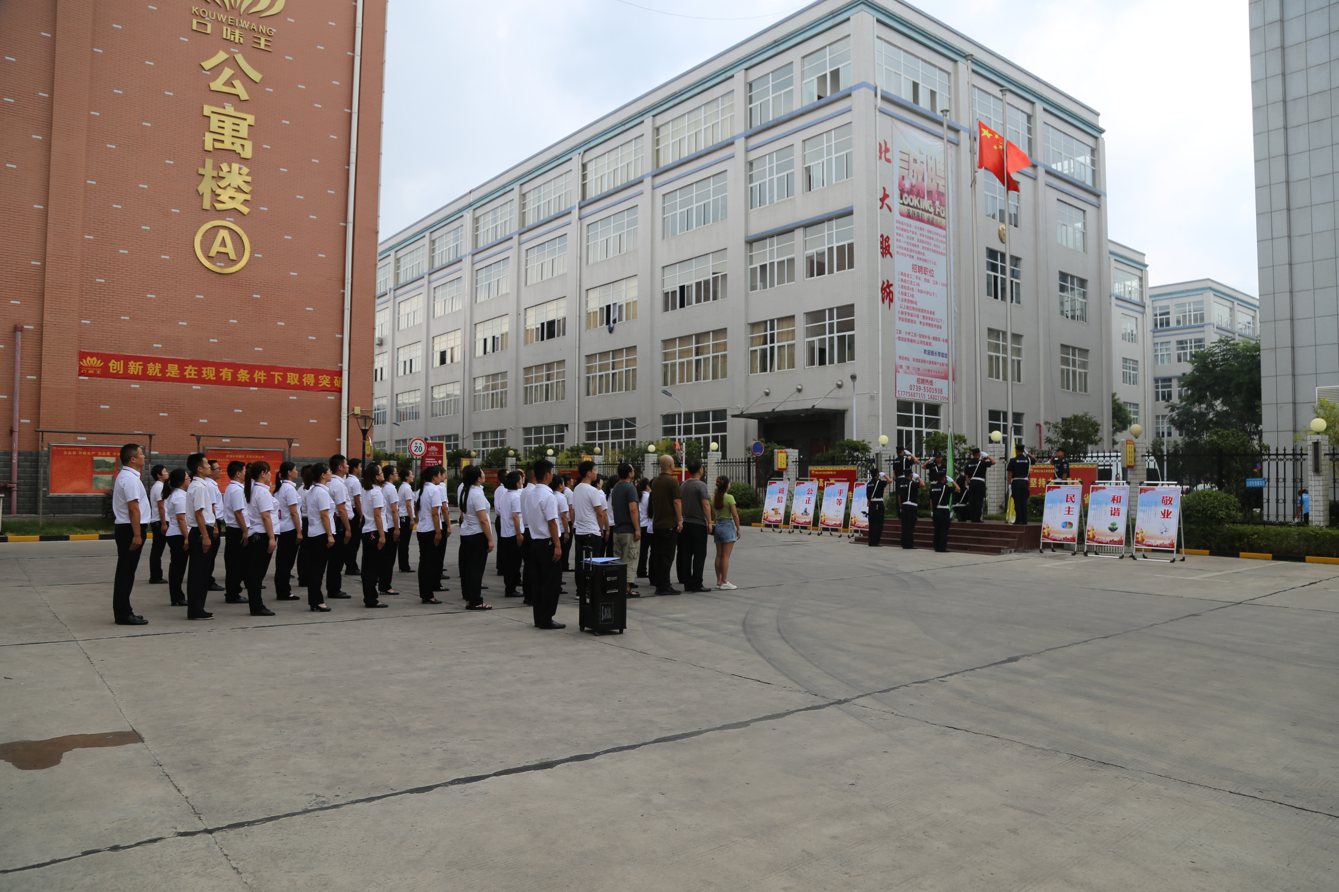 邵阳文明网9月27日讯 为响应“庆祝中华人民共和国成立70周年,组织开展主题宣传教育”号召,9月26日上午,在邵阳经开区口味王槟榔厂举行升国旗仪式,公司领导、高管及职工参加。