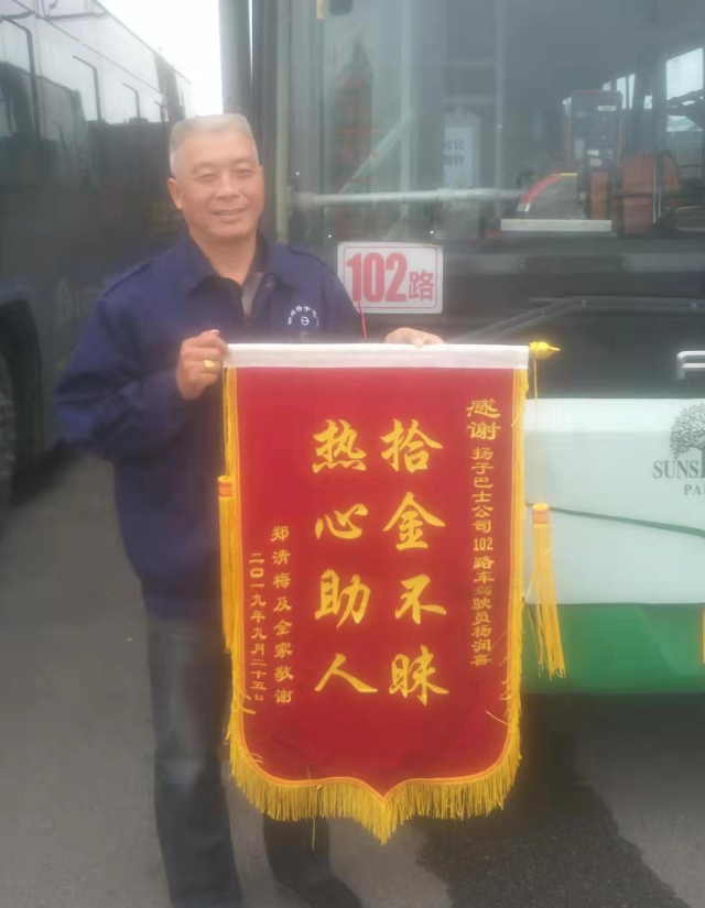 原来,9月25日上午,102路29号车驾驶员杨润喜,在车内搞卫生时,发现座位上有个包,马上拍图汇报给分公司,分公司要求妥善保管。不久,乘客租车来找包。杨师傅仔细询问了乘客包里都有什么物品,见乘客回答完全正确,就把包还给了失主。失主第一时间拨打了扬子巴士营运部的电话,感谢其公司驾驶员同志拾重金不昧的高尚行为,10月11日又特意给驾驶员送来了锦旗。