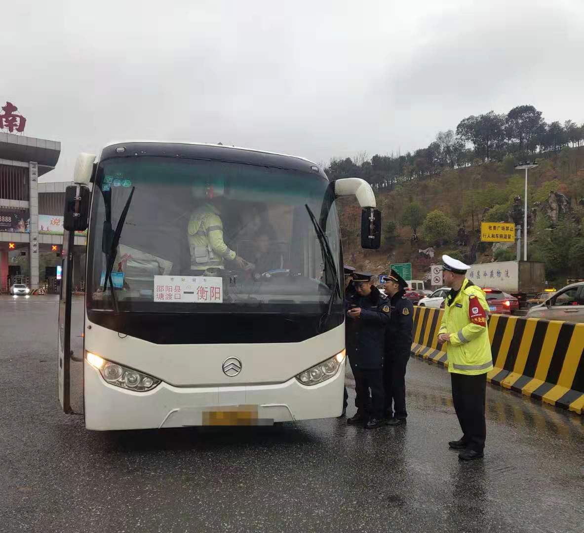 当天下午15时许,一台邵阳县塘渡口至衡阳的大巴车徐徐驶出高速收费站,联合执法人员依法对车辆进行检查,并向驾驶员和乘客宣传春运交通安全知识。同时,联合执法人员对收费站外围违停车辆进行驱离,对大巴车站外上下客行为依法查处。