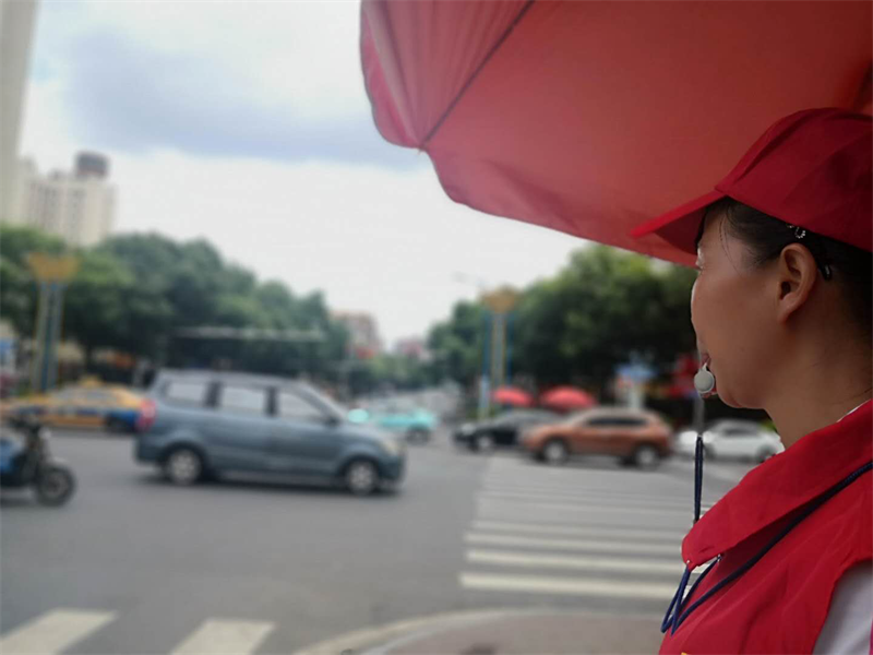 注视着来往车辆的交通秩序整治志愿者