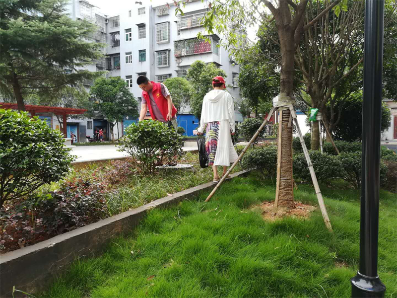 社区工作者在小区清理草坪杂物