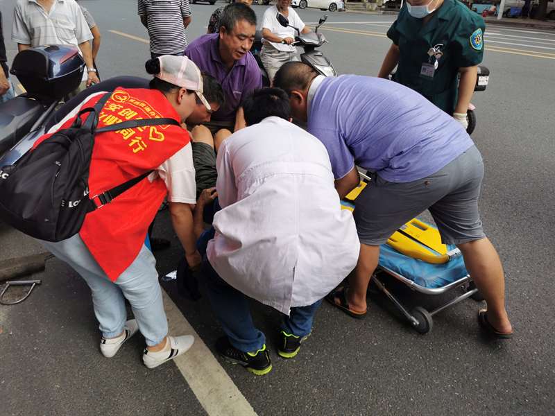 邵阳文明网讯 一声巨大的撞击声,吸引了城西街道干部贺文斌以及西湖社区干部谢正旭、马迎欢的注意力。6月17日上午9点10分左右,他们正在辖区宝庆西路沿线开展创文集中志愿服务,突然发现一个老人骑电动车撞到了路边的护栏,当场摔倒在地,电动车还压在了老人身上,他们当即跑上前,把电动车扶起来,询问老人情况后,发现老人不能起来,而且有头部受伤和胸闷的情况,马上拨打了120,在救护车来之前,西湖社区干部马迎欢带领热心群众,用老人手机联系了他家人,并一直守在老人身边,撑起太阳伞帮他遮阳,并不断给老人扇风,告诉老人不要急,救护车马上就来。