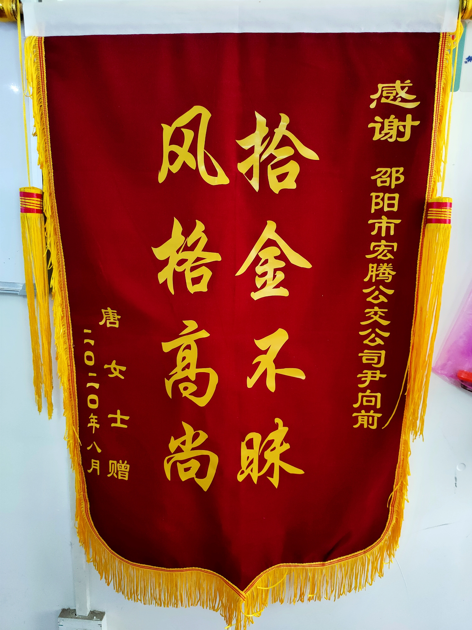 邵阳文明网讯 9月15日,一位六旬老人将一面印有“拾金不昧,风格高尚”字样的锦旗送到邵阳市宏腾公汽公司,感谢该公司驾驶员尹向前拾金不昧的优秀品质。