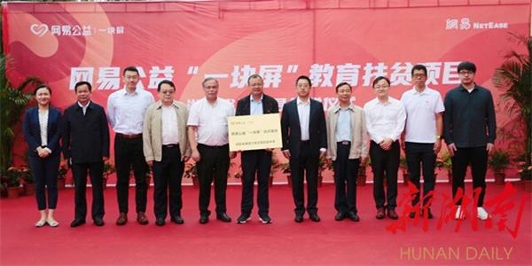 2018年,网易集团启动网易公益“一块屏”教育扶贫活动。今年,针对优质教育资源分布不均衡的问题,网易深化“一块屏”教育扶贫模式,将全国首个教育扶贫试点基地落地邵阳县,向邵阳县10所中小学捐赠智能教育硬件设备、数字教育资源、教育平台产品,包括同步课堂多媒体硬件、网易公开课、有道云教室等。