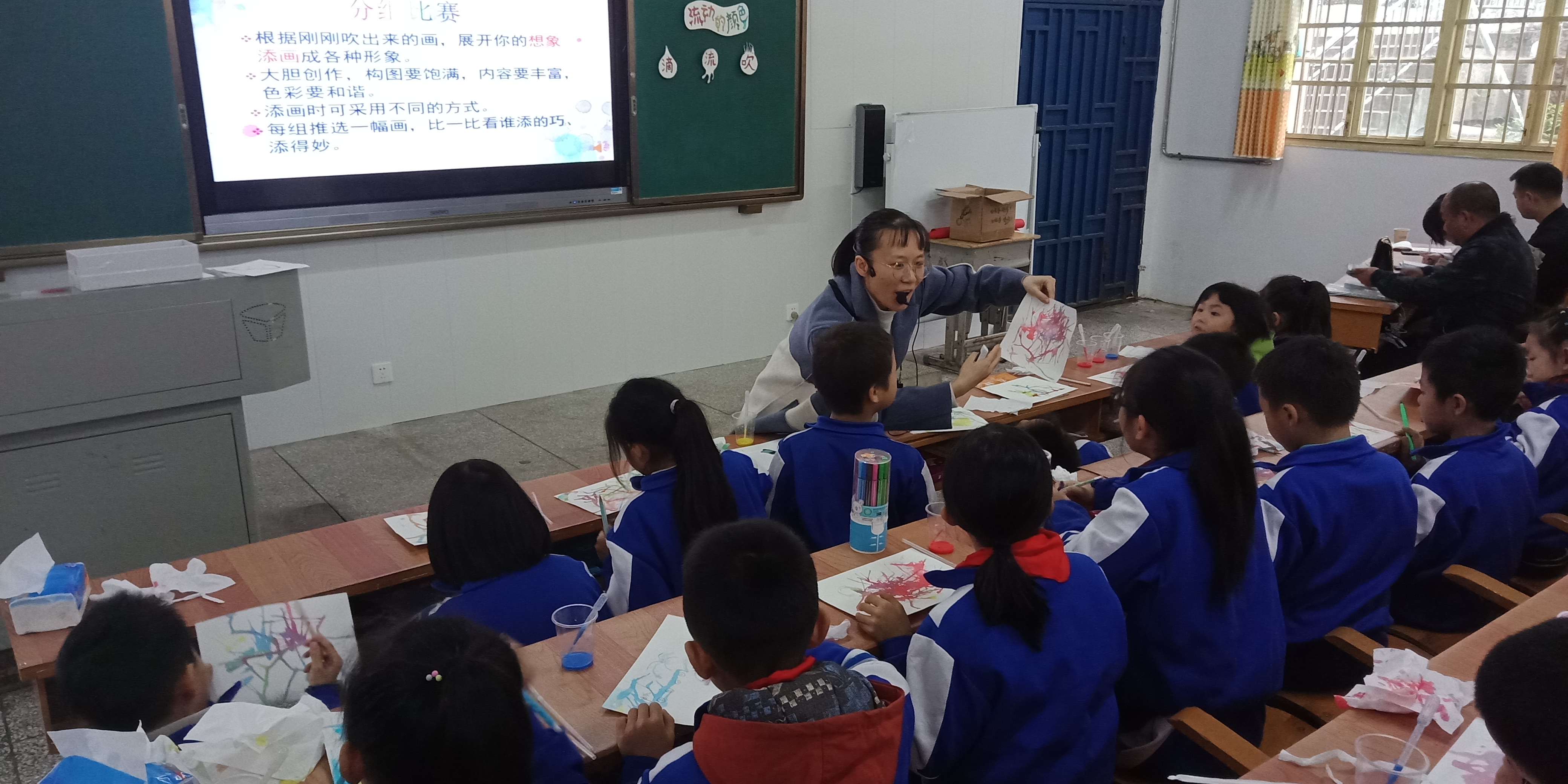 在周嘉老师的经典诵读中开始了一天的培训。今天的“重头戏”就是戴梦静老师的美术初建课《流动的颜色》。戴老师带领二年级的孩子们走进了奇妙的色彩世界,颜色的交融、变化,让孩子们惊叹不已。戴老师以她深厚的专业基本功、充满童趣的讲解,让孩子们很快的掌握了“滴、吹、流”的绘画技巧,通过丰富的案例打开了孩子们添画的想象之门,他们无穷的想象力被激发,创作出很多优秀的美术作品,也让在场的老师为之震撼。随后的说课评课环节,学员们纷纷表示这是一堂成功的美术课,同时也提出了各自的宝贵意见。