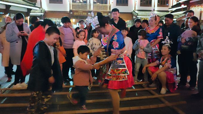 邵阳文明网讯(通讯员 张先邵)苗舞与侗歌,余音犹沓沓。11月22日,笔者从绥宁县大园演艺传媒有限公司获悉,该公司演职人员将苗家竹杆舞跳进了武冈城,同保楼附近市民、学生纷纷学跳竹竿舞,场面十分热烈,成了当晚整个演出活动的高潮。