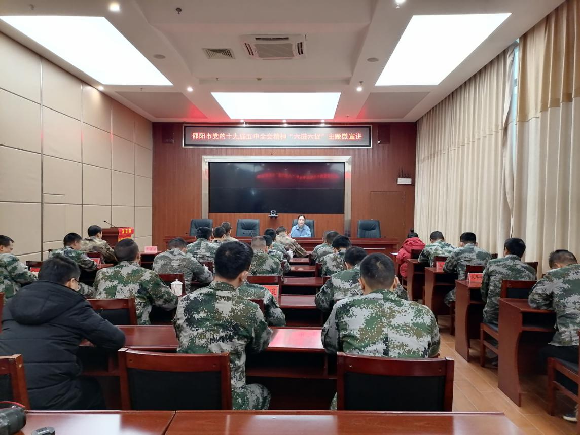 邵阳文明网讯 “全面加强练兵备战,提高捍卫国家主权、安全、发展利益的战略能力,确保二〇二七年实现建军百年奋斗目标……”1月7日,邵阳市党的十九届五中全会精神“六进六促”主题微宣讲在大祥区人武部开展微宣讲,市委党校肖璐璐老师带领30余名人武干部,结合全会精神阐析国家安全。这样的宣讲在该区将开展99场次,其中市委宣讲队进农村4场次、进区人武部1场次,区乡两级宣讲队进社区农村94场次。